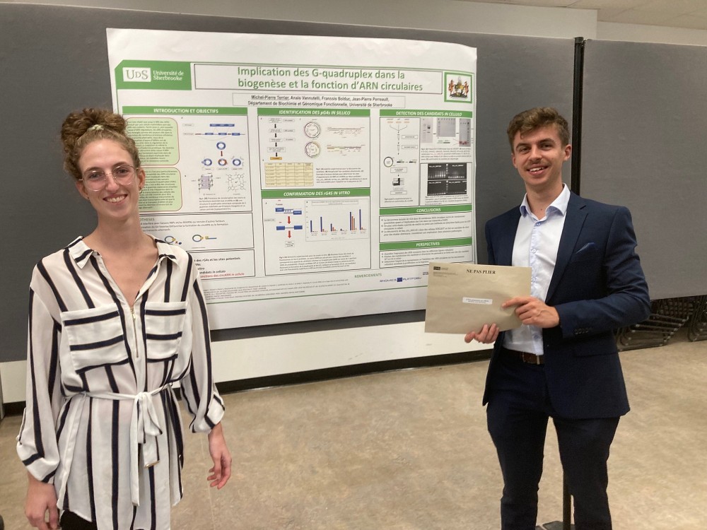 Lors de la Journée scientifique de 1er cycle du 16 septembre dernier, Michel-Pierre Terrier s'est mérité le 2e Prix de présentation par affiche, prix de 200$. Michel-Pierre débutera sa maitrise dans le laboratoire de Jean-Pierre Perreault en janvier 2023.