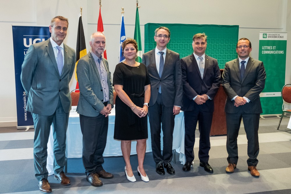 L’entente officielle entre l’Université catholique de Louvain et l’Université de Sherbrooke, devant mener à la création d’un nouveau cheminement en communication stratégique internationale à la maîtrise, est maintenant signée! Des représentantes et des représentants des deux universités ont en effet officialisé leur collaboration lors d’une cérémonie à l’Université de Sherbrooke à laquelle assistaient de nombreux dignitaires, dont l’ambassadeur de Belgique au Canada, Son Excellence Monsieur Johan Verkammen.