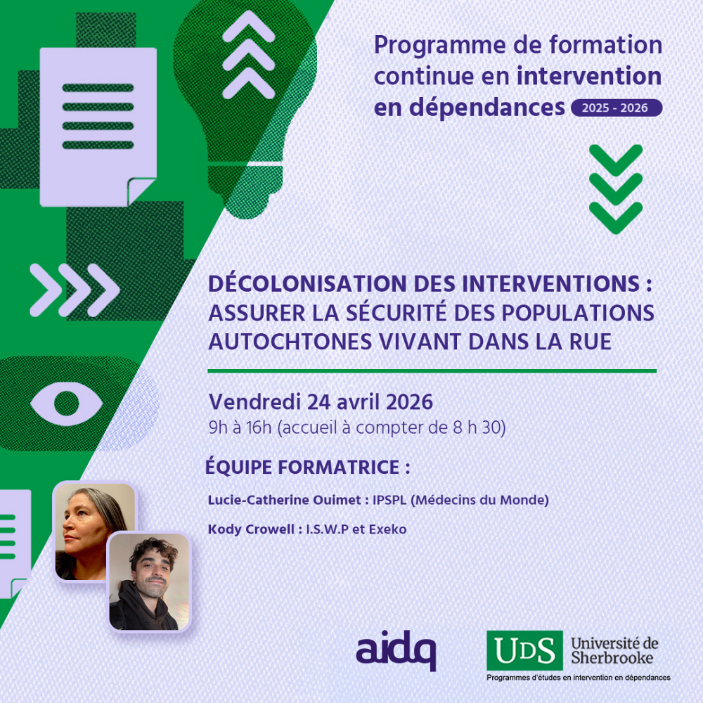 Cette formation d'une journée examine l'héritage complexe de la colonisation, de la déconnexion culturelle, des traumatismes intergénérationnels et de l'exclusion institutionnelle dans le contexte de l'itinérance, de la santé mentale et de la consommation de substances chez les Autochtones. Les personnes participantes déconstruiront les approches coloniales du travail social et exploreront les différences entre les conceptions autochtones et non autochtones du chez-soi et de la santé. Des études de cas pratiques et des exercices de jeux de rôle seront utilisés pour engager les participant-e-s dans des modèles de soins culturellement sécurisants et des approches axées sur la réduction des méfaits et tenant compte des traumatismes, favorisant l'autonomie et la communauté. Les personnes participantes apprendront à gérer les crises, à établir la confiance et à naviguer dans les défis éthiques complexes liés au maintien des limites et à la gestion des dynamiques de pouvoir. À travers des cercles de partage et des discussions de groupe, ils apprendront également à identifier et à remettre en question leurs propres préjugés afin de mieux soutenir les populations autochtones de manière relationnelle et non paternaliste.