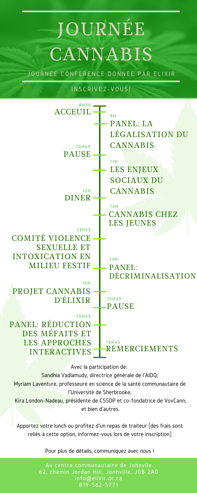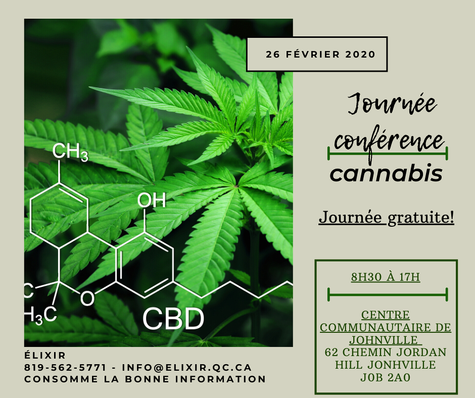 L'organisme Élixir, dont la mission est de réduire les conséquences négatives liées à l’usage de substances psychoactives (alcool, tabac, médicaments psychotropes, cannabis, cocaïne, MDMA, etc.) chez les femmes de 16 ans et plus de la région estrienne, organise une journée conférence gratuite sur le thème du cannabis.