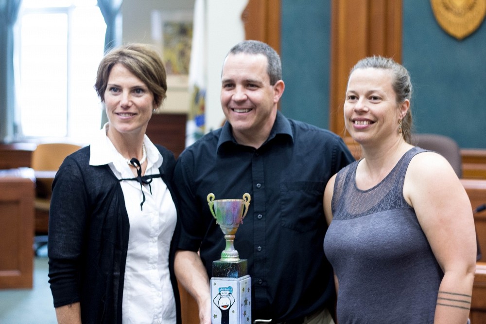 Christine Ouellet, conseillère municipale, présidente du comité de l’environnement à la Ville de Sherbrooke et porte-parole du mouvement Sherbrooke ville équitable, a remis le Prix reconnaissance à Patrice Cordeau, de l’Université de Sherbrooke, pour les actions qui ont mené à la désignation d’un campus dit équitable. Elle était accompagnée par Mélanie Brière, agente d’éducation au Carrefour de solidarité internationale.