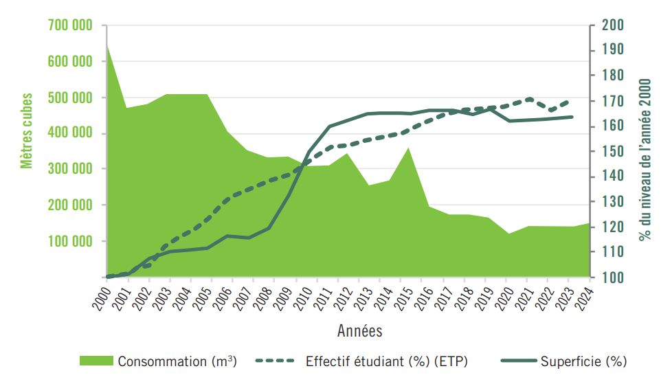 La consommation d’eau potable de l'UdeS a diminué drastiquement dans le temps, et ce, malgré la forte croissance du parc immobilier et de la population universitaire. Sur le Campus principal, elle a été réduite de 77 % depuis l’année 2000 et de 59 % depuis 2015. Cette performance se compare avantageusement à la cible de réduction de la Stratégie québécoise de l’eau 2018-2030, qui est de réduire de 20 % la consommation d’eau par rapport à celle de 2015.