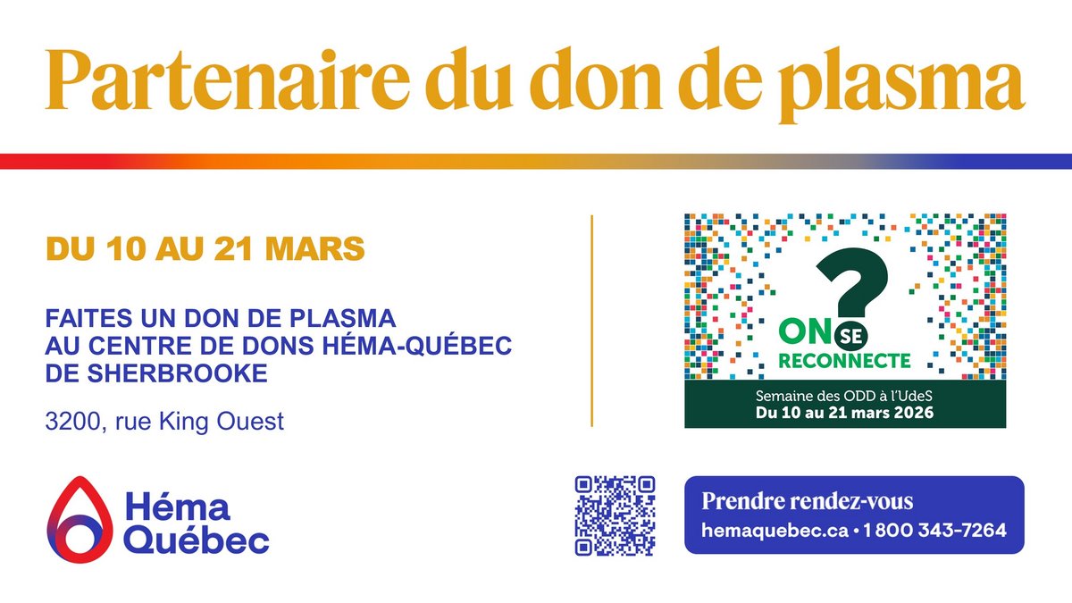 Participez à un geste concret pour sauver des vies ! Prenez rendez-vous pour donner du plasma entre le 10 et le 21 mars au Centre de dons Héma-Québec de Sherbrooke au 3200, rue King Ouest, local A-170, Sherbrooke (Québec) J1L 1C9.