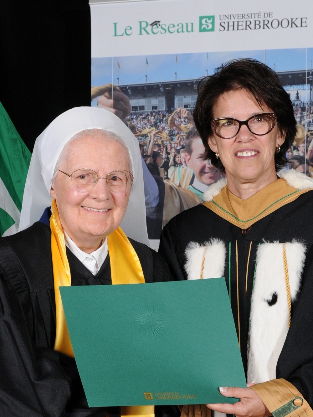 Pour marquer le caractère solennel de l'événement, les diplômées et diplômés de 1963 ont revêtu la toge et l'étole aux couleurs de l’Université de Sherbrooke, soit l’or et le vert. Ainsi parés, ils ont assisté à la cérémonie principale de la collation des grades qui se tenait dans le stade extérieur de l’Université de Sherbrooke. Quelque 10 000 personnes ont pu saluer chaleureusement leur présence.