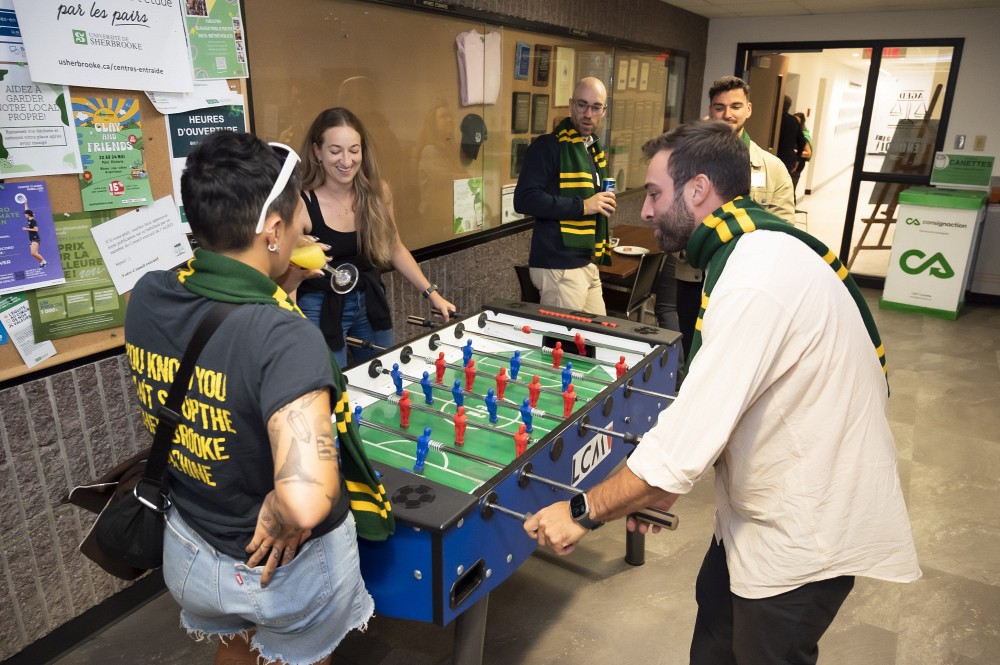Les diplômées et diplômés portaient avec fierté leur foulard aux couleurs de l'UdeS, en se remémorant les éléments marquants de leur passage. Certains ont préféré échanger avec leurs collègues de promotion à la bibliothèque, d'autres ont même choisi d'entamer une joute de babyfoot! Par la suite, bon nombre d'entre eux ont assisté au match de football qui se tenait sur le campus.