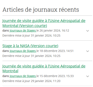 Le bloc Articles de journal récents permet d'afficher les derniers articles vos journaux de monPortfolio.