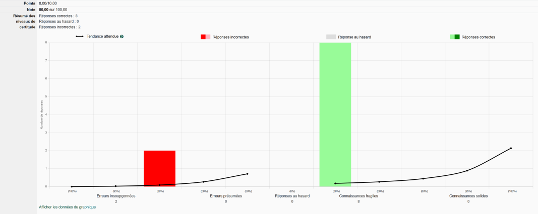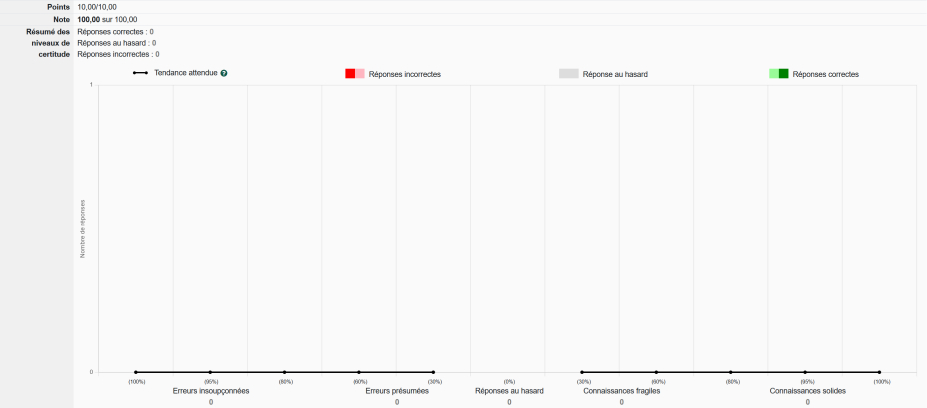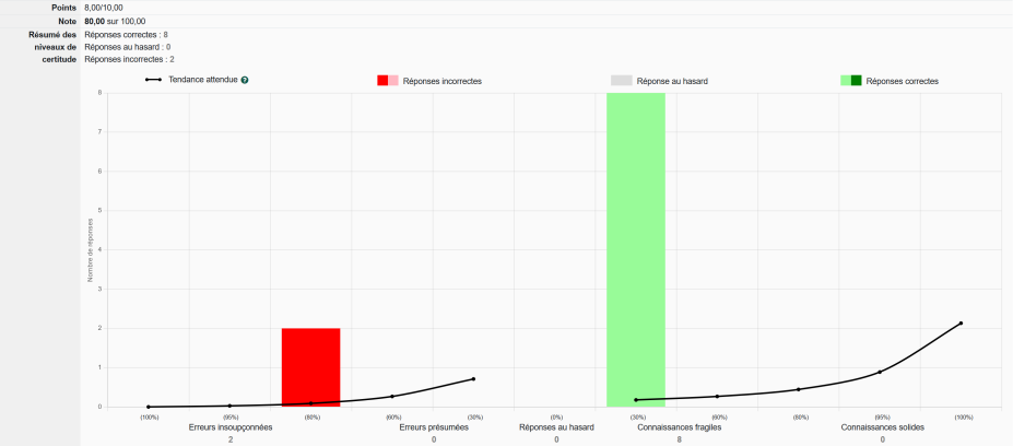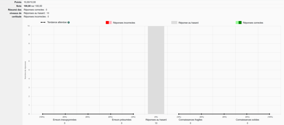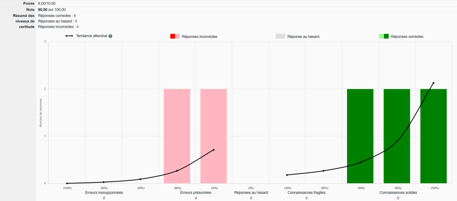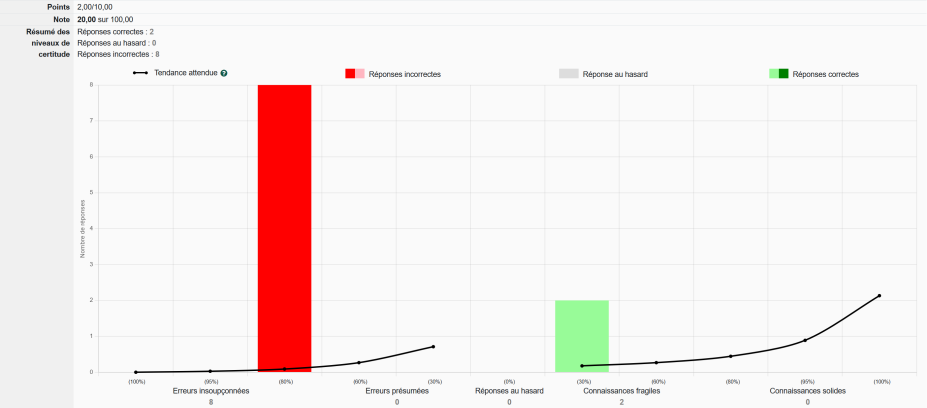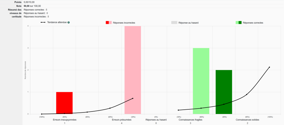 De façon générale, il est attendu que, dans un test de connaissances, certaines questions peuvent avoir des réponses inexactes. Dans cette situation, les mauvaises réponses devraient avoir un indice de certitude faible, c'est-à-dire que la personne étudiante convient de façon explicite que la bonne réponse lui échappe.