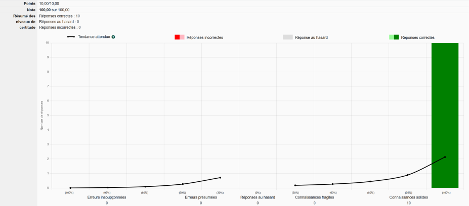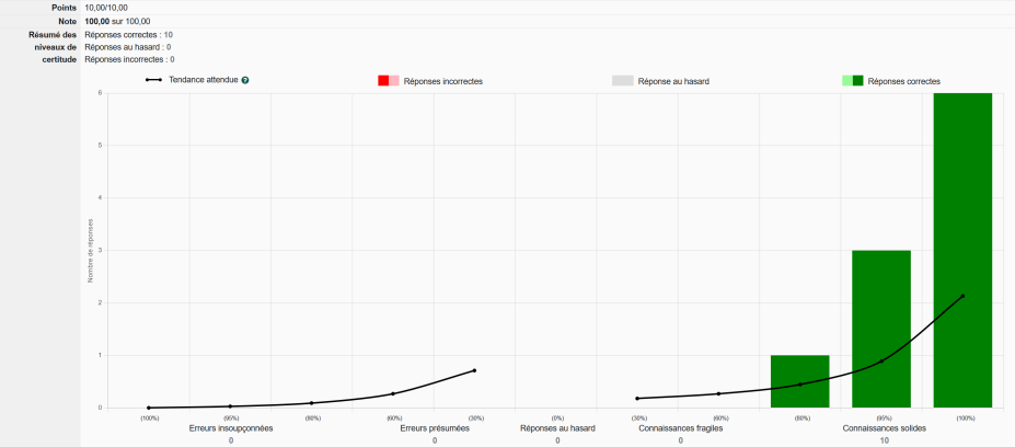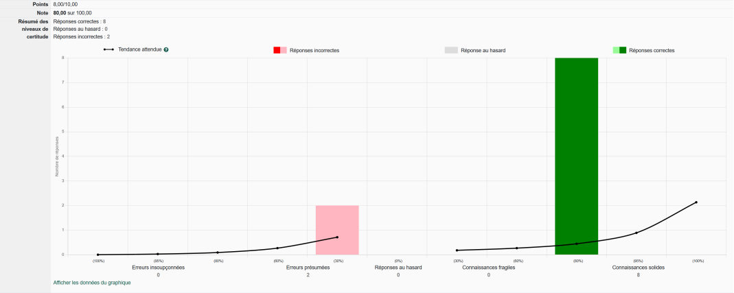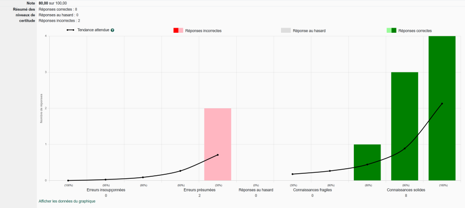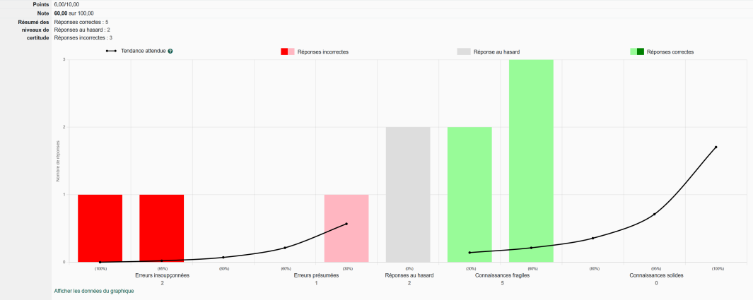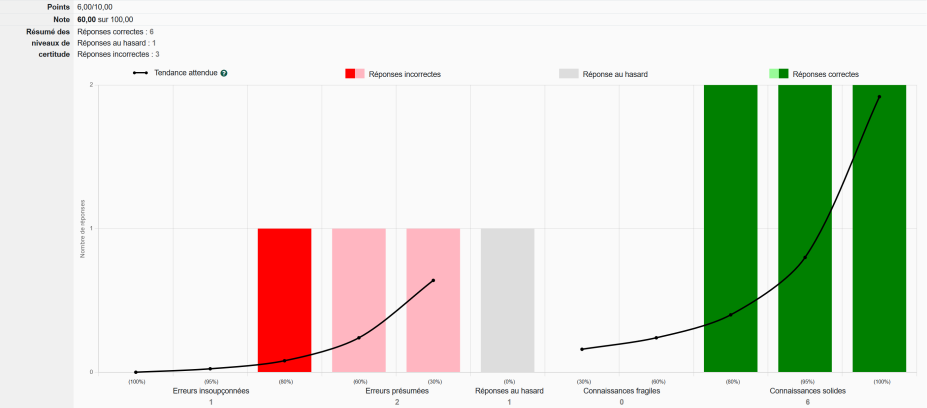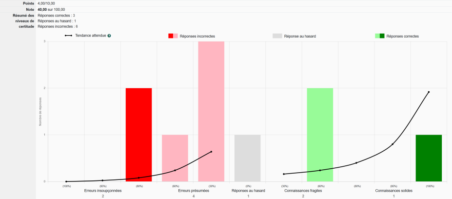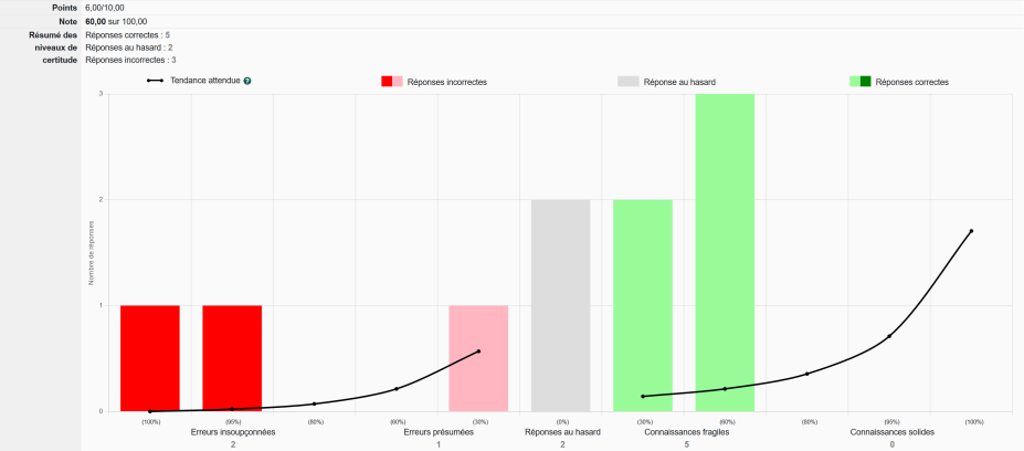 - Révéler les lacunes réelles: Une personne étudiante peut donner une réponse correcte par hasard, mais un indice de certitude faible révèle qu'elle ne maîtrise pas vraiment le concept.