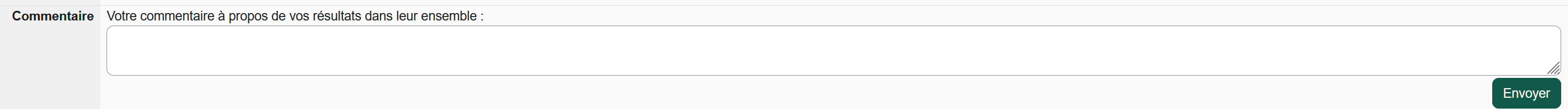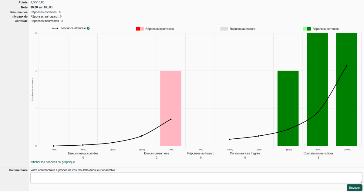 En tant que personne responsable du cours qui propose l'utilisation de l'indice de certitude dans une ou plusieurs activités Test de Moodle, il serait possible de demander aux personnes étudiantes de commenter leur performance dans la zone réservée à cette effet (sous le graphique des résultats).