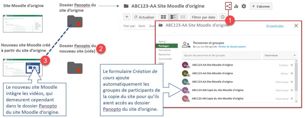 Non, les vidéos ne sont pas copiées dans le nouveau dossier Panopto associé au nouvel espace de cours. Cependant, si la copie du site a été effectuée à partir du formulaire de création de cours (option « Créer le cours à partir de »), des droits d’accès seront automatiquement attribués aux personnes inscrites dans la copie du cours. Pour le vérifier, accédez aux options de partage du dossier du site original environ 30 minutes après la copie du site et vous constaterez que les groupes associés au nouveau site y été ajoutés. Quant au dossier Panopto du nouveau site Moodle, il demeurera vide, mais vous pouvez tout de même l’utiliser pour y déposer de nouvelles vidéos.