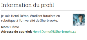 Information du profilCe bloc permet d'afficher une sélection des informations contenues dans votre profil ou dans votre CV.Conseil : Prenez soin à n’afficher que les informations que vous souhaitez partager avec les autres utilisateurs.Référez-vous à Curriculum vitae pour savoir comment rédiger votre CV.PrérequisAvoir ajouté un blocProcédureNommez le bloc⚓Sélectionnez les rubriques que vous désirez afficher sur la page⚓La liste n’affiche que les rubriques pour lesquelles vous avez entré de l’information.Cliquez sur Enregistrer pour terminer l'opération⚓RésultatLe bloc Information du profil est maintenant affiché dans la page.