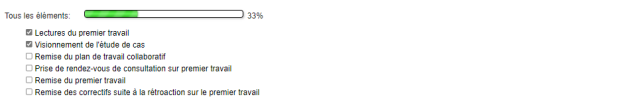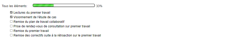 La Liste des tâches permet 1) de présenter de façon épurée, récapitulative et interactive les tâches incontournables à accomplir par les personnes étudiantes, et 2) de suivre leur progression au fur et à mesure qu'elles complètent les éléments de la liste.