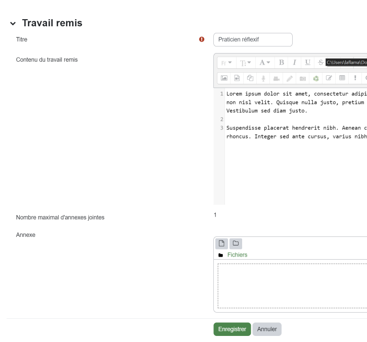 Toute personne étudiante qui participe à cette activité doit impérativement effectuer une remise. Dans notre étude de cas, il s'agit d'une (très) courte rédaction en ligne.