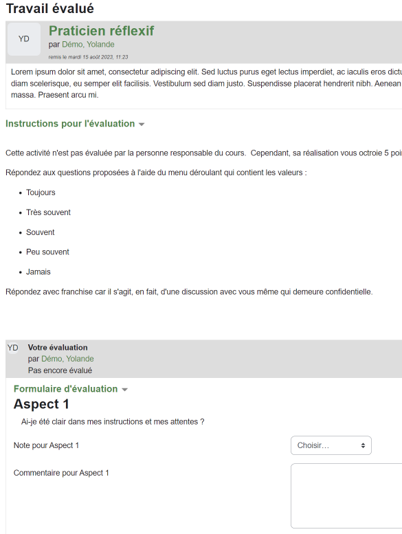 L'activité Atelier est centrée sur la remise des travaux des personnes étudiantes et de leurs évaluations par les pairs. Recentrer cette activité sur la personne étudiante plutôt que sur un travail remis exige quelques contorsions dans Moodle.