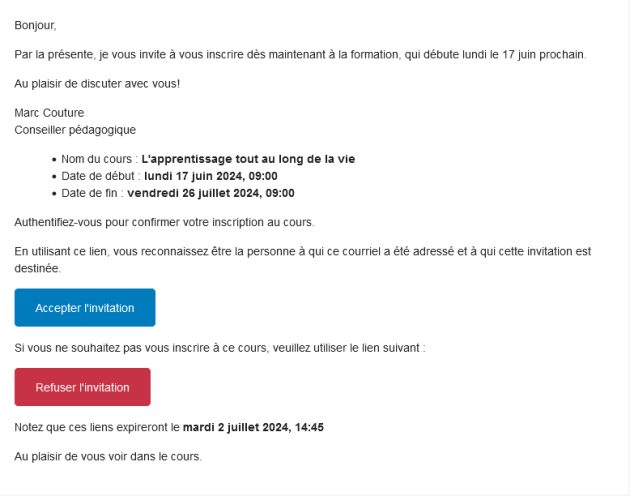 La ou les personne(s) destinataire(s) peuvent accepter ou refuser l'invitation jusqu'à la date d'expiration de l'invitation (délai initial de 14 jours). En acceptant l'invitation, la personne destinataire est dirigée vers le site du cours et a immédiatement accès à ses contenus.