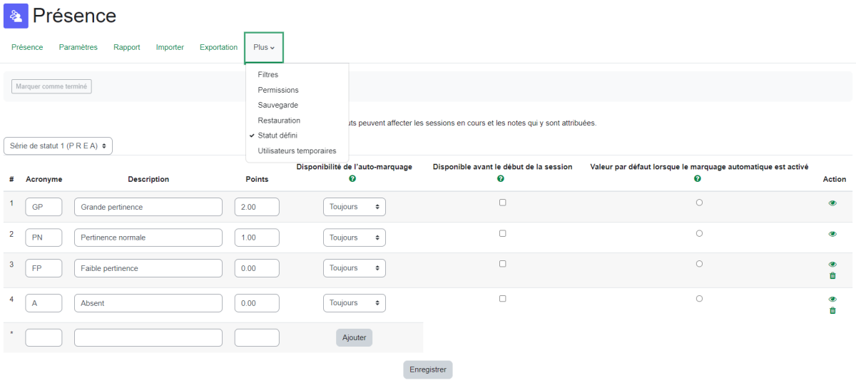 | Suivi des absences et retards aux séances de cours pour soutenir les interventions de sensibilisation Comptabilisation des absences et retards en soutien aux rencontres d'équipes Auto prise de présence aux cours par les personnes étudiantes dans le but de favoriser la responsabilisation Suivi des absences et retards pour des examens en présence Attribution de points à la qualité de la contribution aux échanges verbaux en petite classe en modifiant la Définition des catégories de participation dans l'onglet Plus / Statut défini (ex. : Interventions orales : De grande pertinence +2points ; De pertinence moyenne +1point ; De faible pertinence +0points)