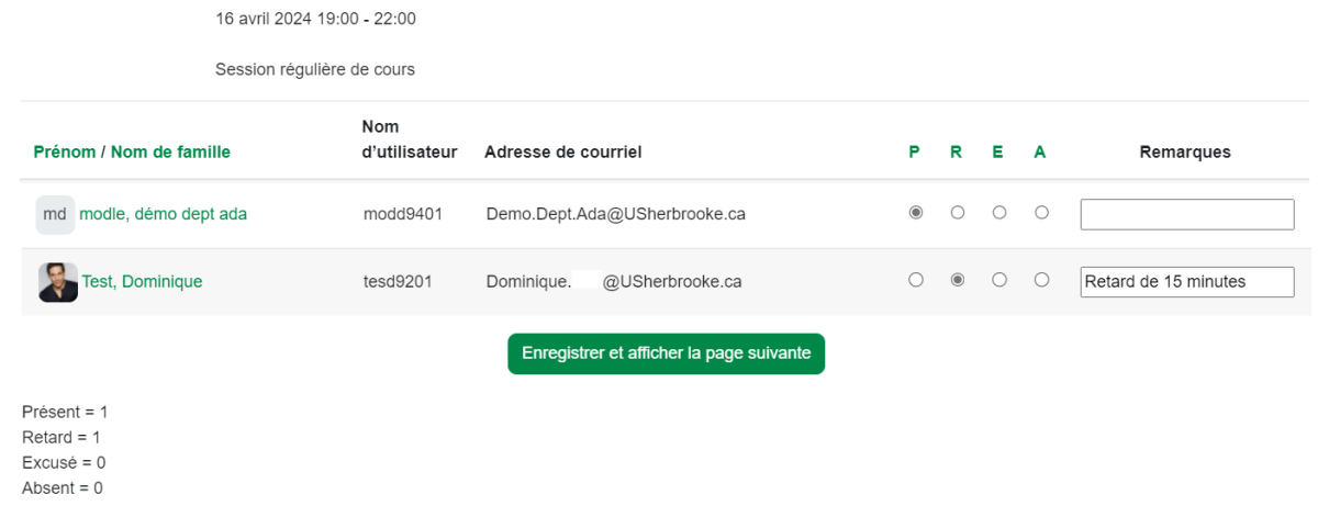 L'activité Présence permet à la personne enseignante d'enregistrer les présences (Présent, Absent, Retard, Excusé, ou autres définitions) des personnes étudiantes lors des séances de cours et permet aux personnes étudiantes de visualiser leur rapport de présence.