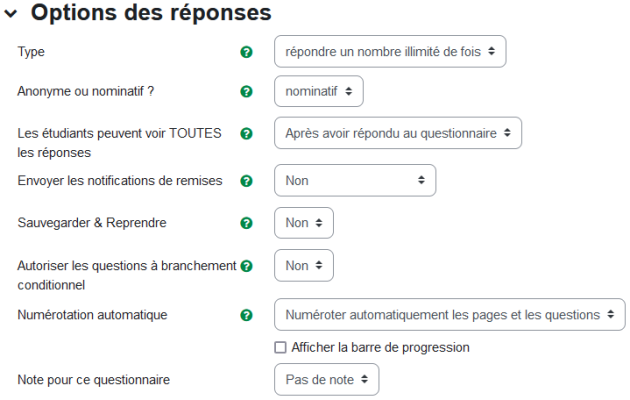 Enregistrer & reprendre les réponses⚓ - Non (par défaut) : oblige les personnes étudiantes à remplir le questionnaire en une seule fois.