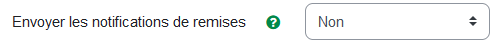 Envoyer des notifications de soumission : détermine si la personne enseignante reçoit une notification lorsqu'une soumission est effectuée.⚓ - Non (par défaut) : le système de notification de Moodle n'envoie pas de notification lorsqu'une soumission est effectuée.