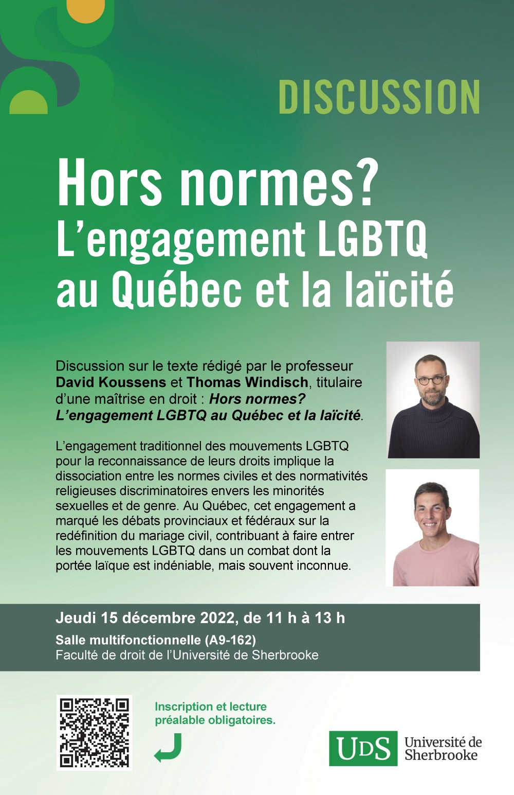 Discussion au sujet du texte rédigé par le professeur David Koussens et Thomas Windisch, titulaire d'une maîtrise en droit : Hors normes? L’engagement LGBTQ au Québec et la laïcité.