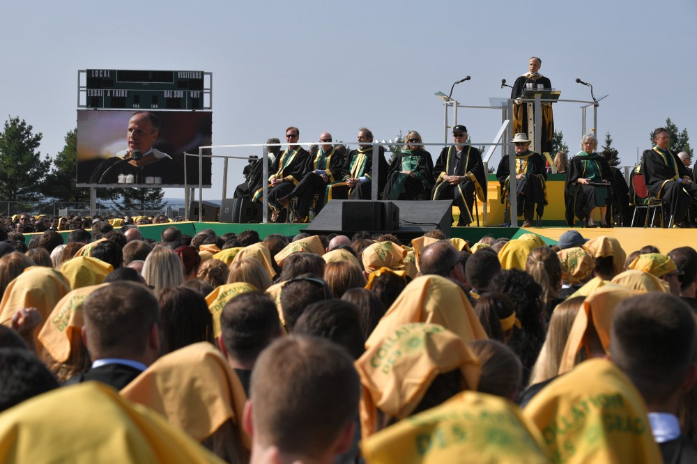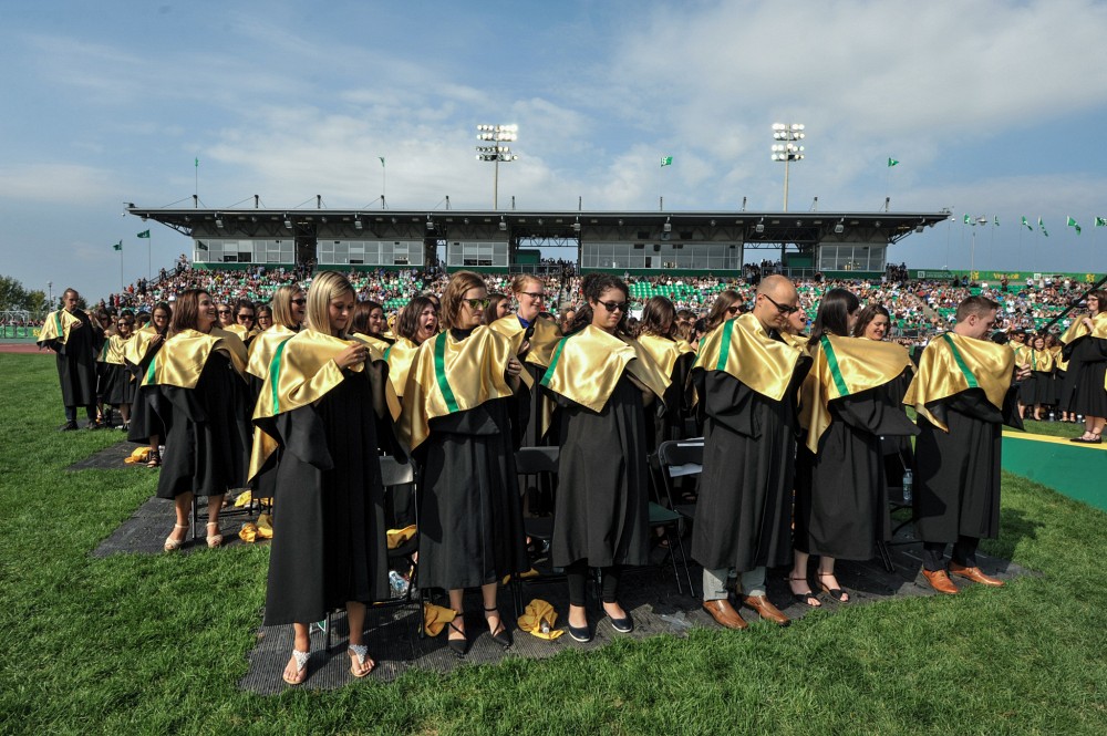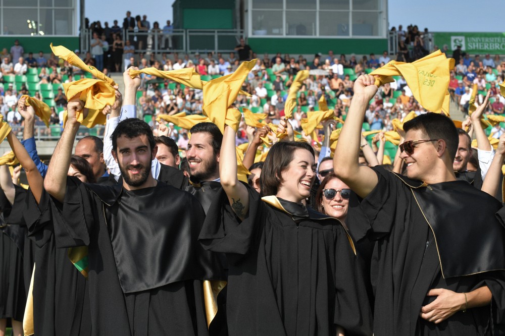 En retournant simultanément leurs capes sous un soleil radieux révélant une déferlante de vert et d’or, les nouveaux diplômés de l’Université de Sherbrooke ont offert un spectacle grandiose aux quelque 12 000 personnes réunies samedi au stade extérieur pour célébrer leur réussite. Les 2800 finissants venus recevoir leur diplôme en mains propres ont ainsi été investis des couleurs officielles de l’UdeS et ont reçu un message exaltant du nouveau recteur Pierre Cossette, qui présidait sa première cérémonie de collation des grades.