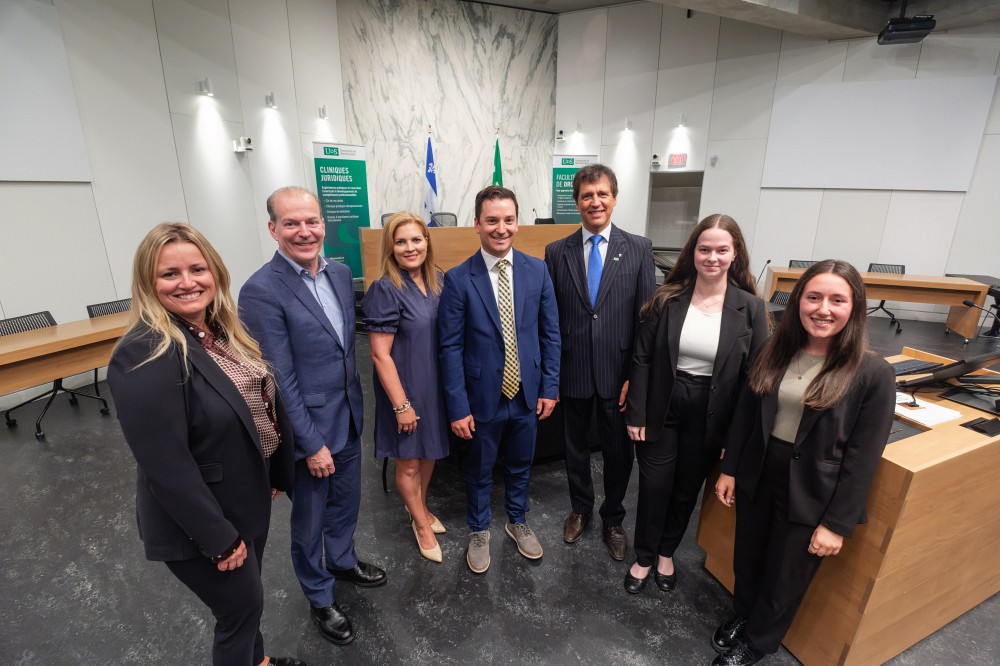 Déborah Montambault-Trudelle, André Bachand, député de Richmond, Geneviève Hébert, députée de Saint-François, Simon Jolin-Barrette, Louis Marquis, Alicia Conn Parsons et Myriam Fortier, deux étudiantes ayant témoigné de leur expérience à la Clé de vos droits.