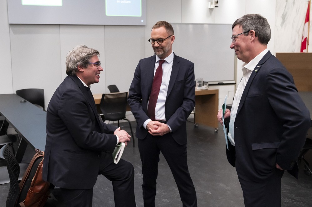 Pr Pierre Noreau, conférencier principal lors de la grande conférence et accompagnateur des chercheuses et chercheurs lors du colloque, Pr David Koussens, vice-doyen à la recherche et aux relations internationales et membre du comité organisateur et Pr Jean-Pierre Perreault, recteur élu.