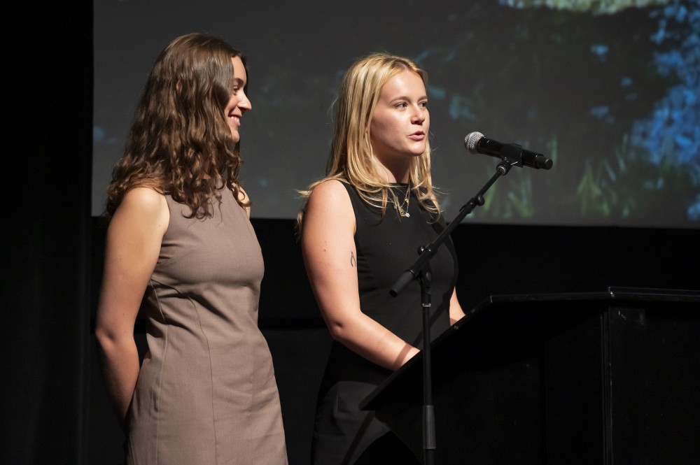 Traditionnellement, un diplômé ou une diplômée prend ensuite la parole pour livrer un témoignage sur son passage à la Faculté et son parcours professionnel. C’est toutefois une formule revampée qui a été proposée cette année, puisque l’invitée spéciale, Me Geneviève Vigneault, associée chez BCF, s’est plutôt entretenue plus librement avec les deux coprésidentes de l’Association générale étudiante de droit (AGED), Clémence Lamer et Frédérique Wallis. Une discussion ouverte sur l’apprentissage du droit, l'expérience offerte à la Faculté de droit de l’UdeS, l’engagement étudiant, les acquis fondamentaux pour réussir sa pratique et l’équilibre entre le travail et la vie personnelle.