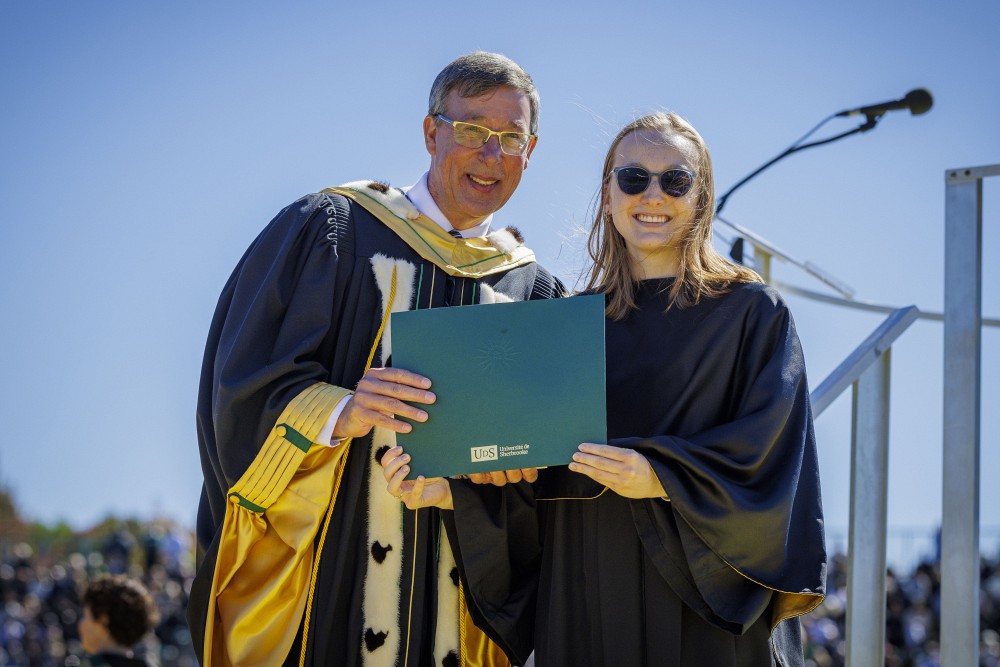 C’est encore une fois sous un soleil radieux que l’Université de Sherbrooke a salué la réussite de ses diplômées et diplômés lors de sa grandiose et désormais légendaire Collation des grades ce samedi 20 septembre. Une magnifique journée qui a ensuite permis à quelque 330 personnes de défiler sur la scène de la cérémonie de la Faculté de droit et du Centre d’études du religieux contemporain pour récupérer leur précieux diplôme.