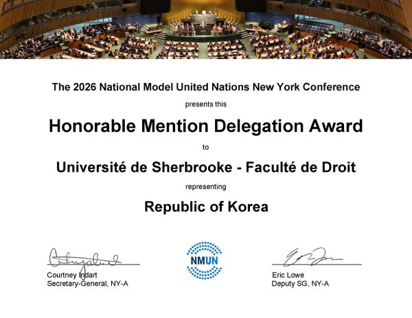 La délégation de l’Université de Sherbrooke, qui représentait la Corée du Sud, s’est démarquée tant par la qualité de ses interventions que par la rigueur de sa préparation, en remportant les distinctions suivantes.