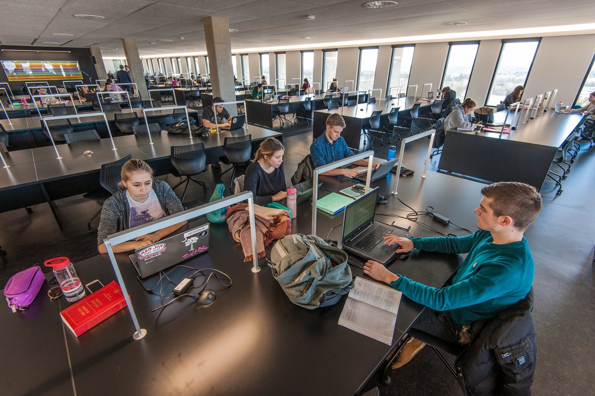 Situé au 3e étage, le vaste réfectoire répond visiblement aux besoins de la communauté facultaire. Les grandes tables de travail donnent aux étudiantes et aux étudiants tout l'espace nécessaire à l'étude et aux travaux individuels. En prime, la fenestration sur trois façades offre un point de vue incroyable sur le magnifique panorama de l'Estrie.