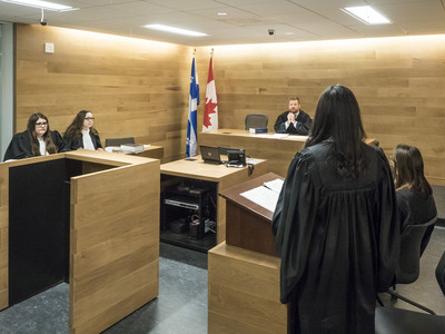 La nouvelle salle de procès simulés a été réfléchie pour reproduire une salle d’audience et permettre l’audition de causes judiciaires. Elle comporte tous les éléments essentiels : banc de trois juges, bureau du greffier, boxes des témoins, tables des avocats, jury, public, etc. S’ajoute un équipement audiovisuel permettant d’enregistrer les débats, les plaidoiries ou les autres événements qui s’y déroulent pour favoriser la rétroaction et l’apprentissage.