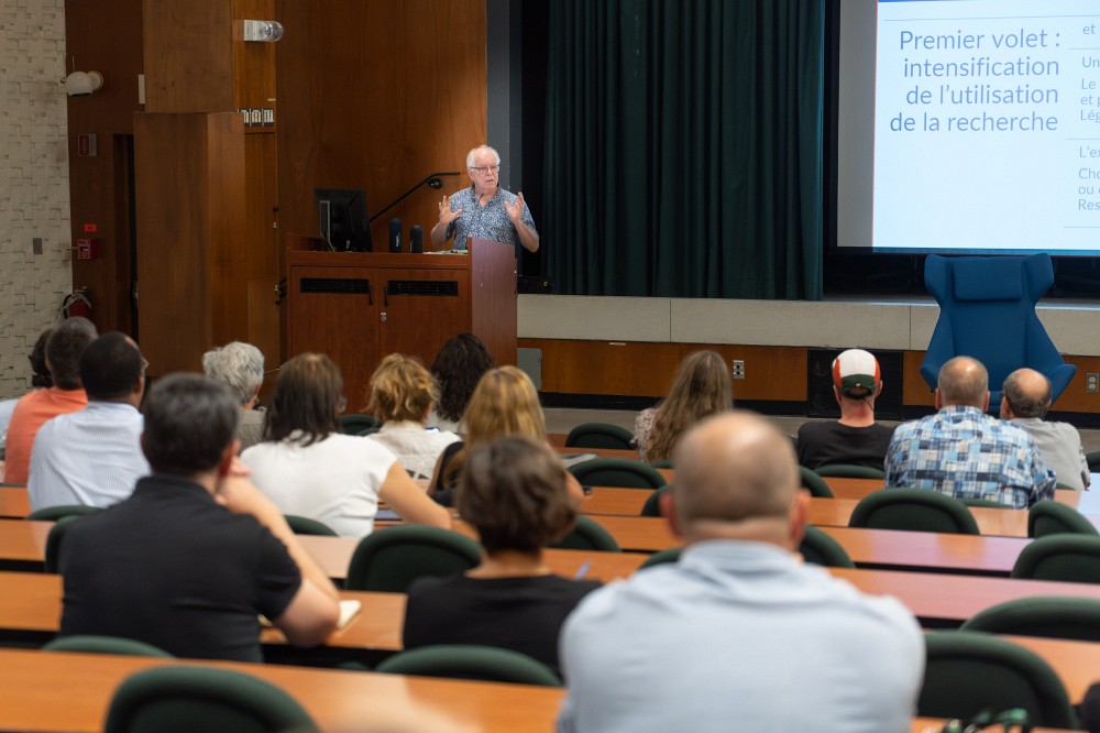 C’est dans l’auditorium René-Hivon que la communauté facultaire s’est rassemblée pour écouter les propos réfléchis et dument appuyés de l’invité. Petite tranche d’histoire : le professeur Lessard a commencé sa présentation en racontant que le professeur René Hivon, figure marquante de la pédagogie universitaire, était responsable de sa première embauche à l’UdeS. Il s’en est suivi pour lui un parcours de grande influence sur le monde de l’éducation au Québec.