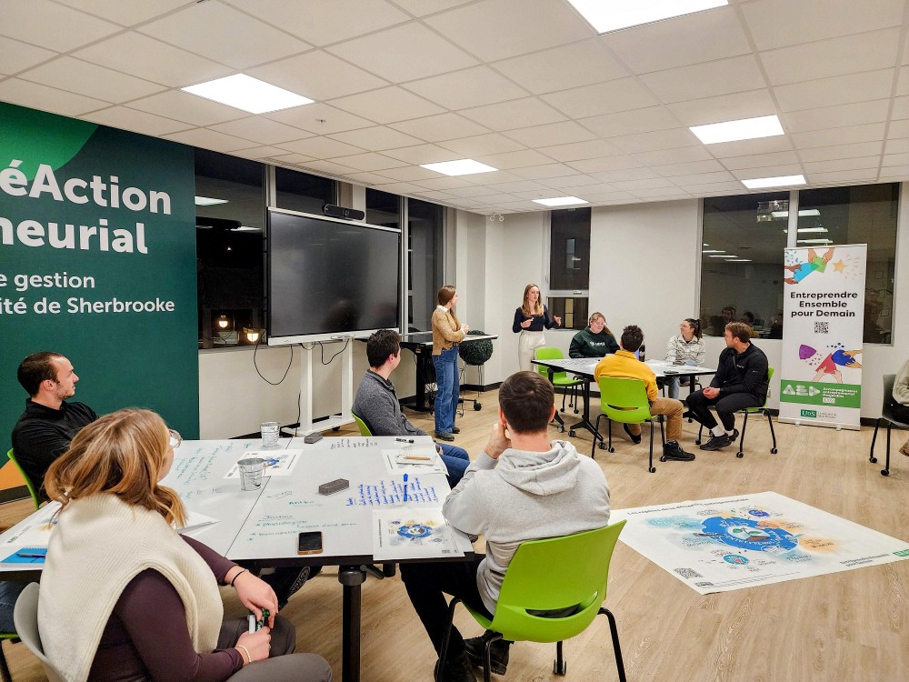 Cette activité avait lieu au QG de l’entrepreneuriat, dans le cadre du programme innovant «Expérience terrain» de l’Accompagnateur entrepreneurial Desjardins (AED) de l’UdeS, donné cet hiver. À cette occasion, les personnes étudiantes bénéficient d’une bourse de 825 $ pour leur projet.