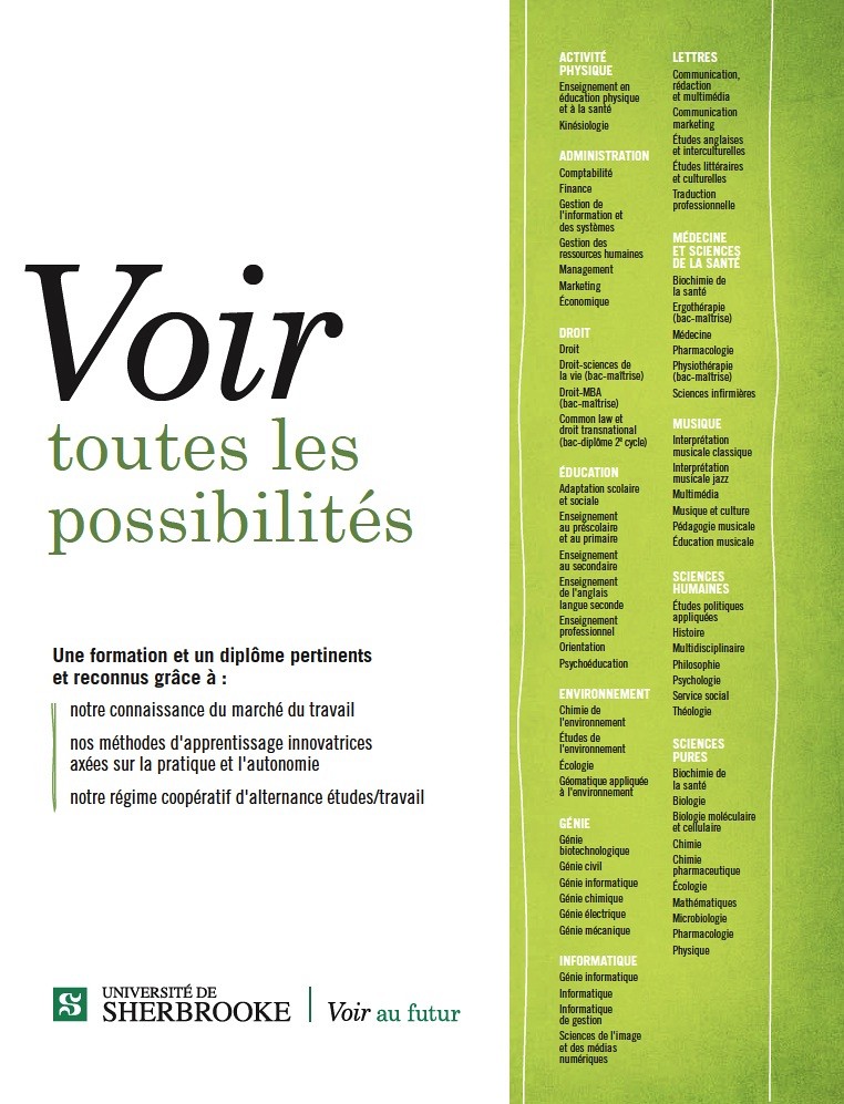 Voir au futur : tel est le nouvel énoncé de positionnement de l’Université de Sherbrooke qui appuiera les initiatives de promotion et de visibilité des prochaines années. La campagne fait appel à plusieurs niveaux de compréhension et met en valeur les grandes caractéristiques de l’UdeS, dont celle d’innover et d’être capable de se projeter dans l’avenir, ainsi que sa responsabilité à l’égard de ses étudiants, de ses employés, de ses partenaires et de la société. Sobre et épurée, la nouvelle campagne remplacera celle qui avait pour thème La vie fait partie du programme et propose une approche différente pour témoigner de la promesse de l’Université à l’endroit de tous ses publics.