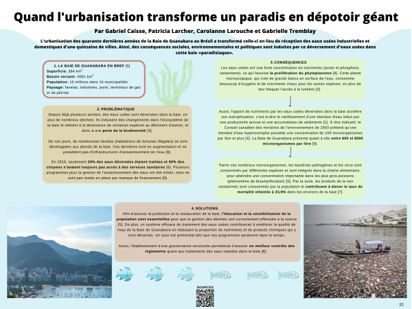 La mention d’excellence pour l’affiche de vulgarisation, quant à elle, a été remise à l’équipe de Gabriel Caisse, Patricia Larcher, Carolanne Larouche et Gabrielle Tremblay pour leur affiche intitulée « Quand l’urbanisation transforme un paradis en dépotoir géant » réalisée dans le cadre du baccalauréat en études de l’environnement.