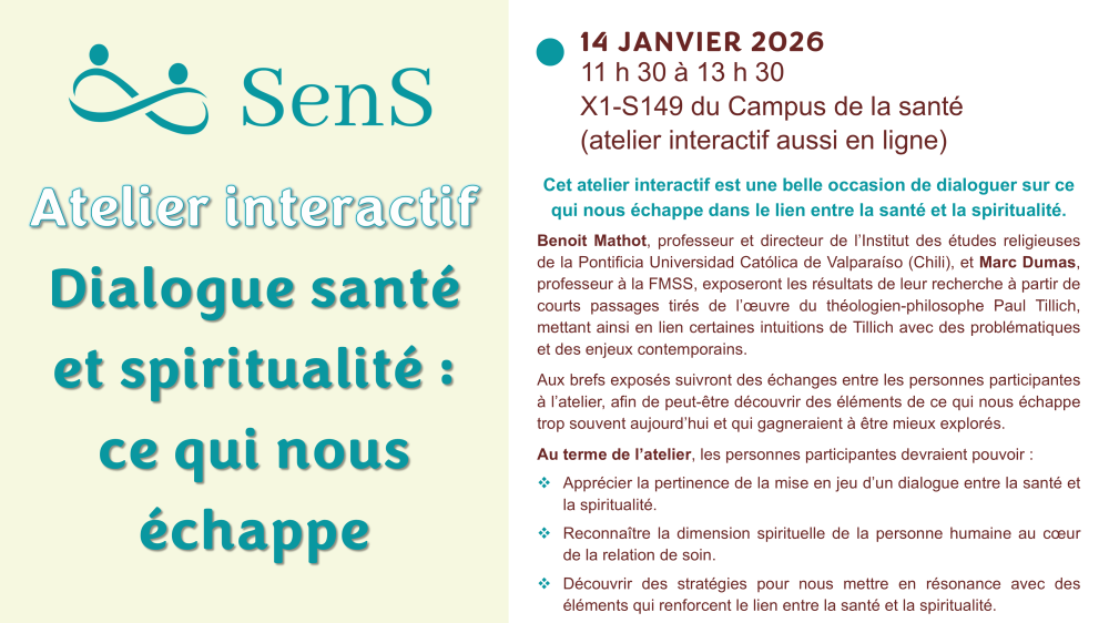 Cet atelier interactif est une belle occasion de dialoguer sur ce qui nous échappe dans le lien entre la santé et la spiritualité.