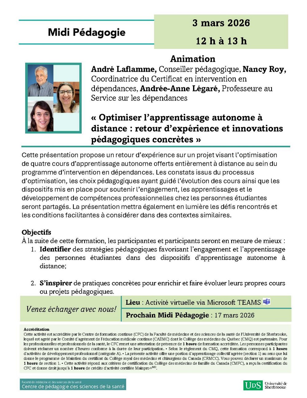 Cette présentation propose un retour d’expérience sur un projet visant l’optimisation de quatre cours d’apprentissage autonome offerts entièrement à distance au sein du programme d’intervention en dépendances. Les constats issus du processus d’optimisation, les choix pédagogiques ayant guidé l’évolution des cours ainsi que les dispositifs mis en place pour soutenir l’engagement, les apprentissages et le développement de compétences professionnelles chez les personnes étudiantes seront partagés. La présentation mettra également en lumière les défis rencontrés et les conditions facilitantes à considérer dans des contextes similaires.