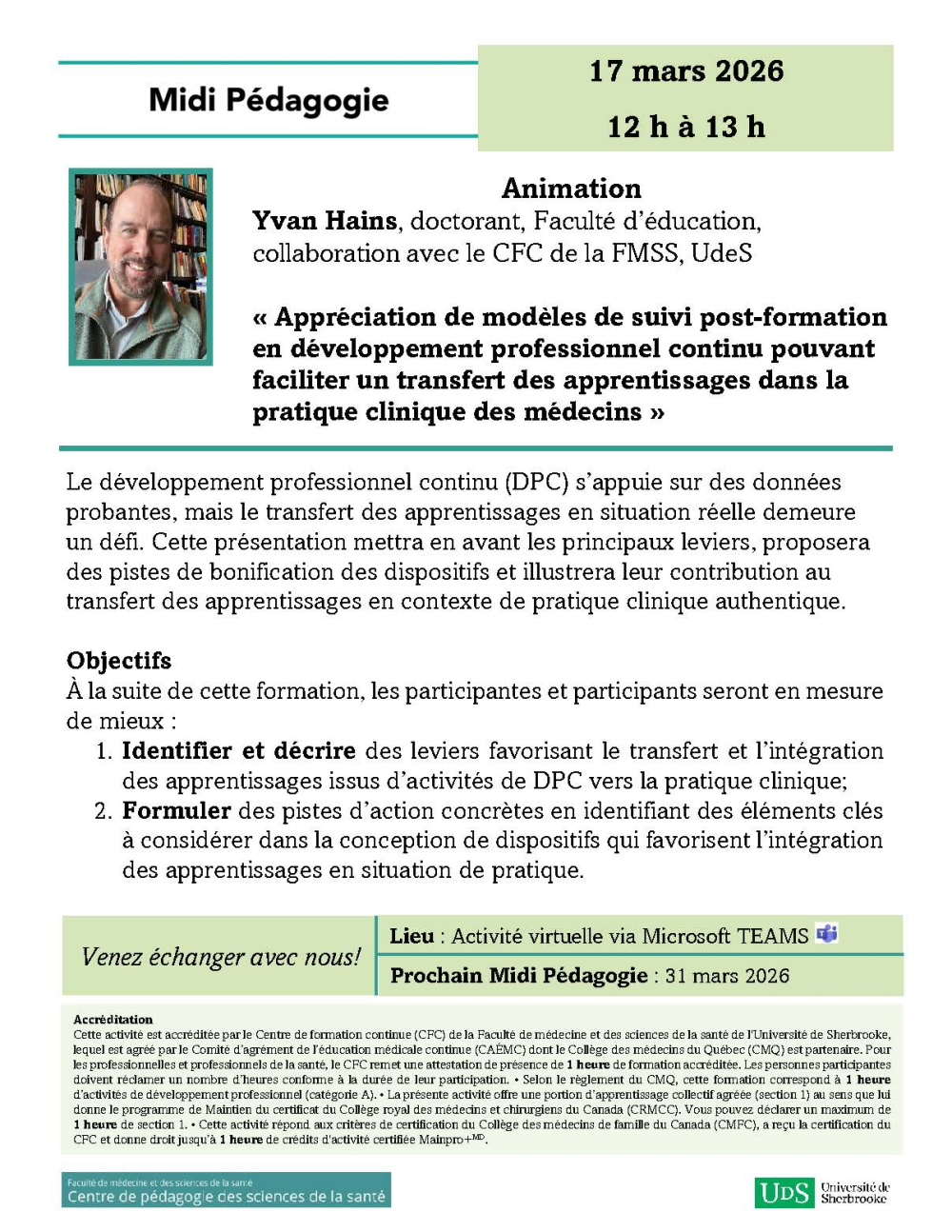 Midi Pédagogie du CPSS · Appréciation de modèles de suivi post-formation en DPC pouvant faciliter un transfert des apprentissages dans la pratique clinique des médecins
