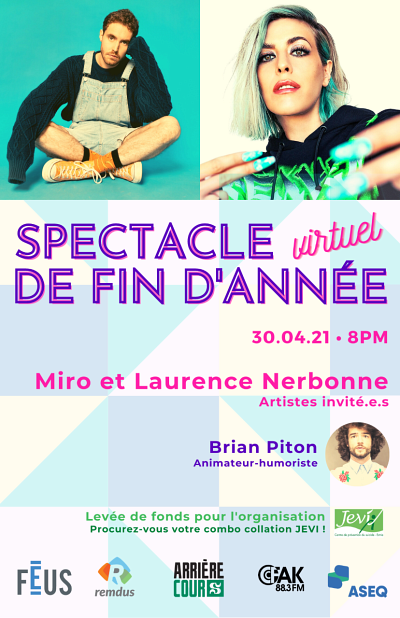 Vous souhaitez célébrer la fin de session en assistant à un spectacle virtuel? Assistez au spectacle de fin de session mettant en vedette Miro et Laurence Nerbonne avec Brian Piton à l'animation le vendredi 30 avril à 20 h.