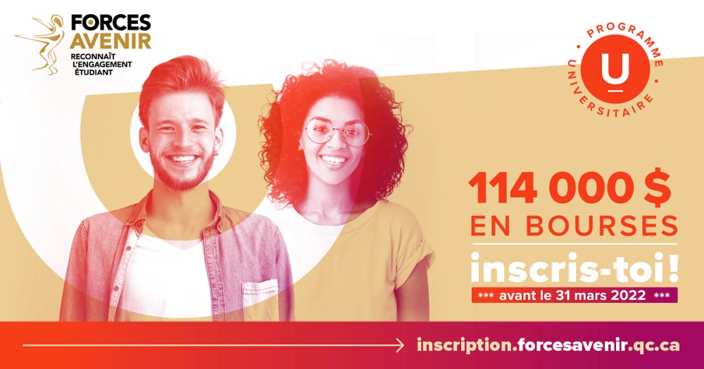 Depuis 1999, le concours Forces AVENIR récompense l'engagement bénévole des étudiantes et étudiants grâce à l'octroi de bourses d'une valeur totalisant 114 000 $ ainsi qu'à l'attribution de nombreux trophées AVENIR. L'année 2022 ne fait pas exception, alors ne tardez pas à soumettre votre candidature!