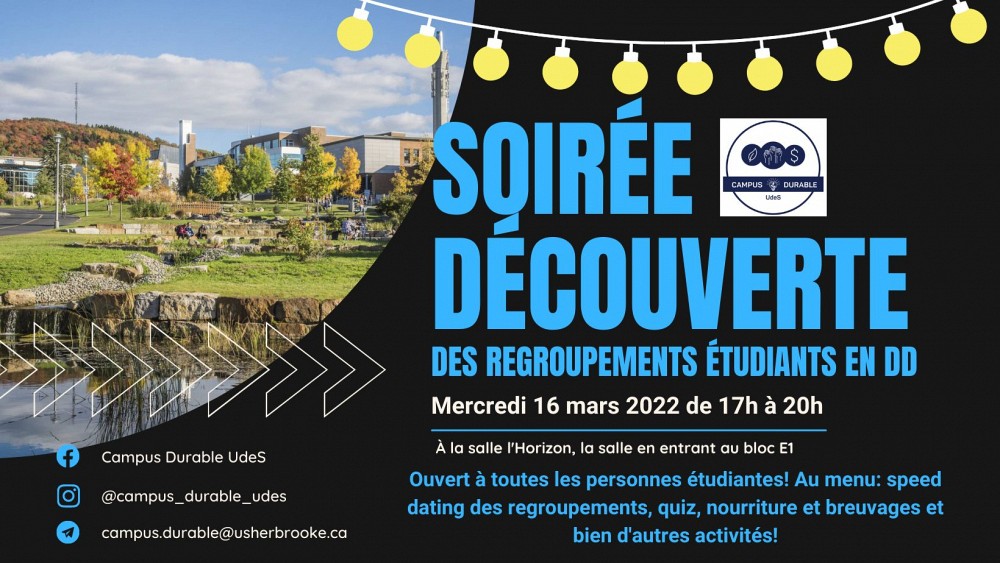 Le mercredi 16 mars aura lieu la Soirée découverte organisée par Campus Durable UdeS. La communauté étudiante est invitée à découvrir les comités étudiants en développement durable les campus de l'UdeS, leurs projets et l’implication à l’UdeS. Bouchées, jeu-questionnaire et échanges sont au programme de cette soirée qui se veut conviviale et interactive.