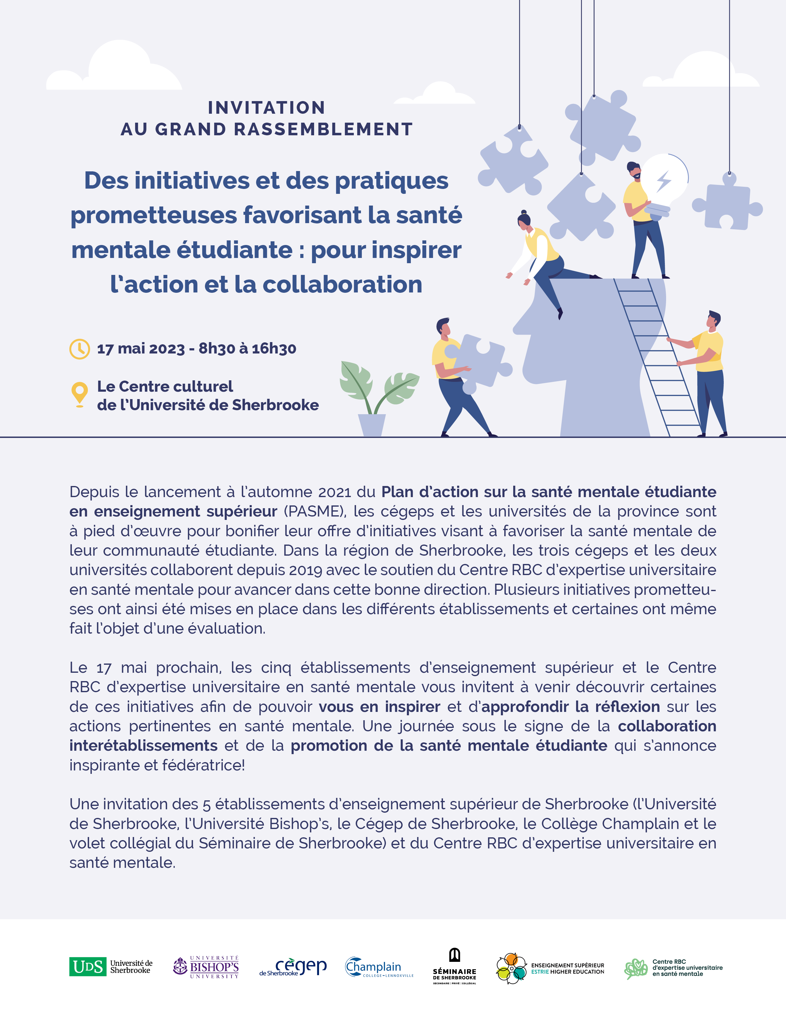 Le 17 mai prochain, les cinq établissements d’enseignement supérieur et le Centre RBC d’expertise universitaire en santé mentale vous invitent à venir découvrir certaines de ces initiatives.