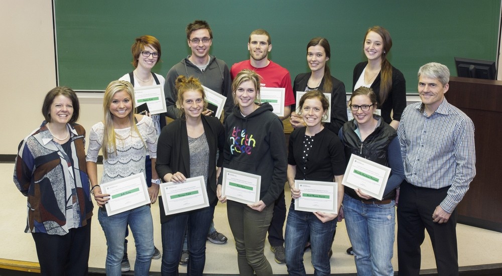 Les lauréates et lauréats 2014 des prix d'excellence entourés de la vice-rectrice aux études, Lucie Laflamme, et du vice-doyen à la formation et à l’internationalisation, Alain Delisle.