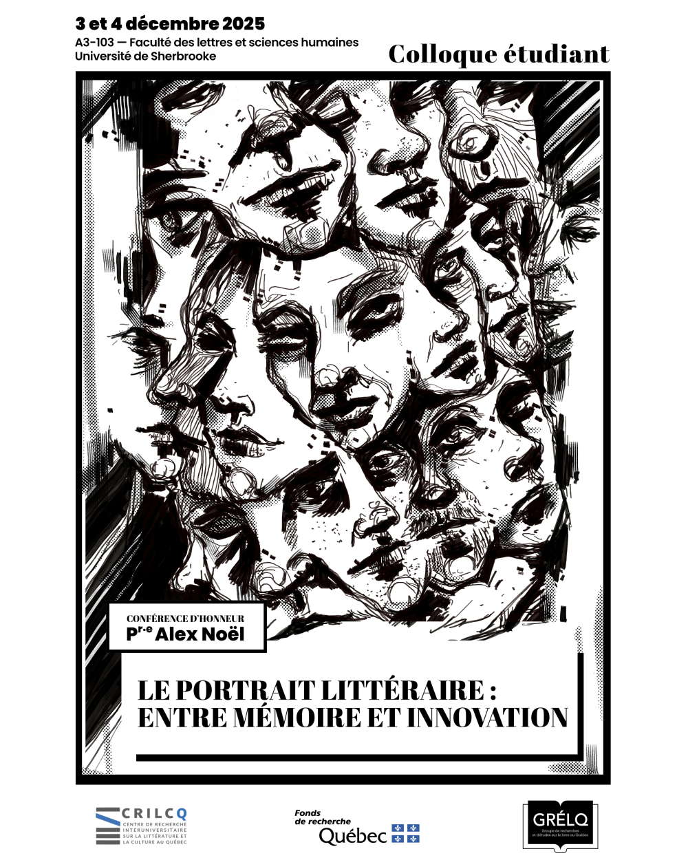 Les 3 et 4 décembre se tiendra un colloque étudiant dans le cadre du séminaire « LIT738 - Le portrait littéraire : entre mémoire et innovation » (prof. Kiev Renaud). Pour l'occasion, nous accueillerons à l’Université de Sherbrooke le prof. Alex Noël (UdeM) pour une conférence d’honneur intitulée « Faire le portrait des angles morts de l’histoire par le reportage littéraire ». Plusieurs thèmes sont au programme pour les autres activités proposées. Les deux journées d’activités sont ouvertes à toute la communauté.