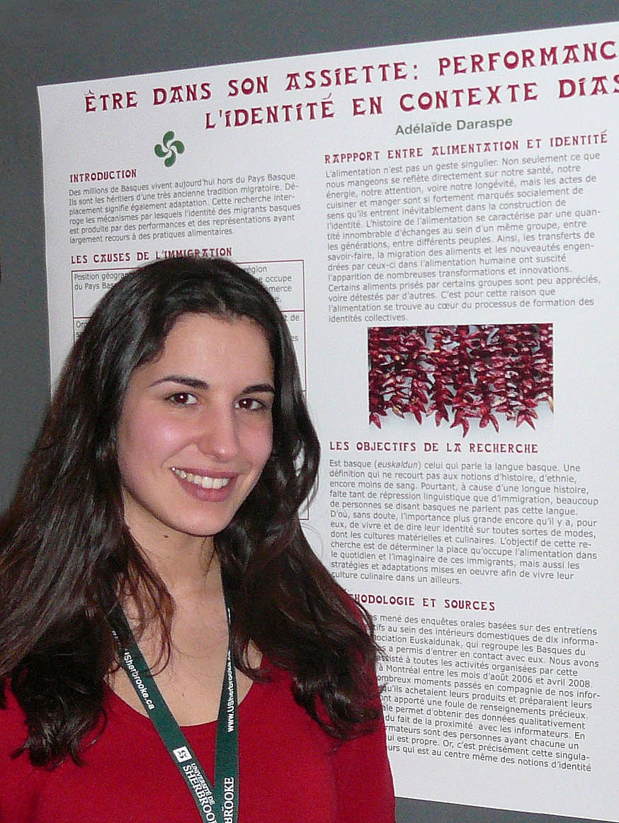 Adélaïde Daraspe a présenté de façon exemplaire ses recherches portant sur la place qu’occupe l’alimentation dans le quotidien du peuple basque. Sur son affiche scientifique, l’étudiante a su illustrer avec brio comment, en contexte d’immigration, l’alimentation est devenue une marque identitaire que chaque individu doit négocier ou réinventer pour composer avec la culture du pays hôte.