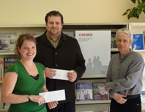 Catherine Bénicy et Christian Raby, tous deux étudiants à la maîtrise en service social, reçoivent leur bourse de 2500 $ en compagnie du directeur du CREMIS, Christopher McAll.