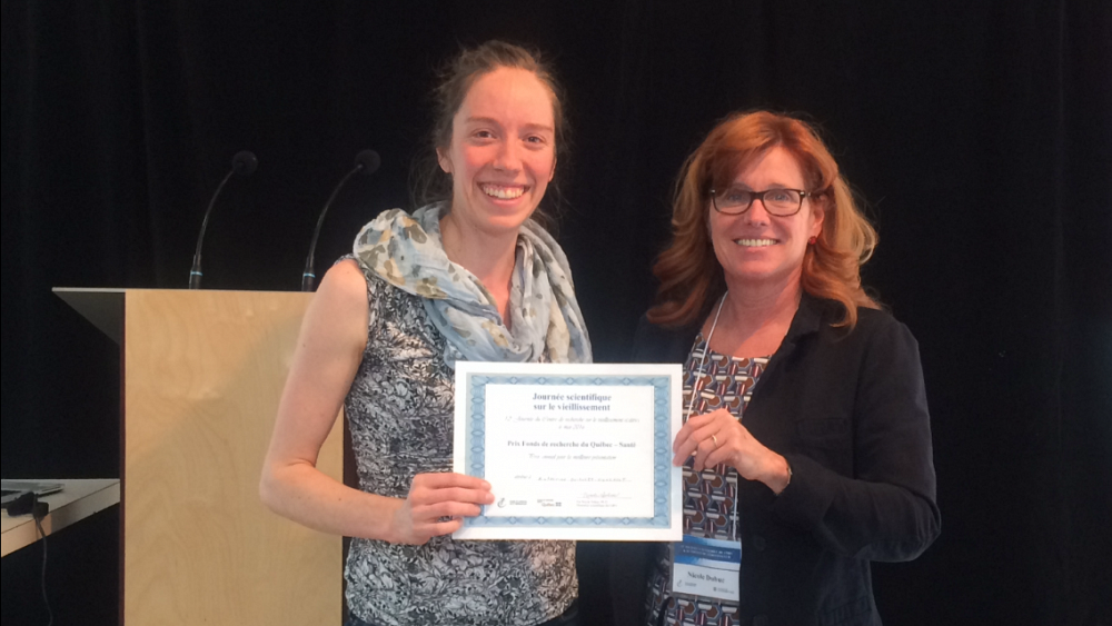 Pour sa présentation « Intensité de l’exercice chez la personne âgée : comparaison entre les mesures pratique et théorique à la marche sur tapis roulant », Katherine Boisvert-Vigneault, étudiante au doctorat en gérontologie, a obtenu le prix FRQS de la meilleure présentation, toutes catégories confondues. Elle a reçu ce prix, assorti d'un montant de 1000 $, dans le cadre de la 12e Journée scientifique du Centre de recherche sur le vieillissement et du 26e Gérontoclub.
