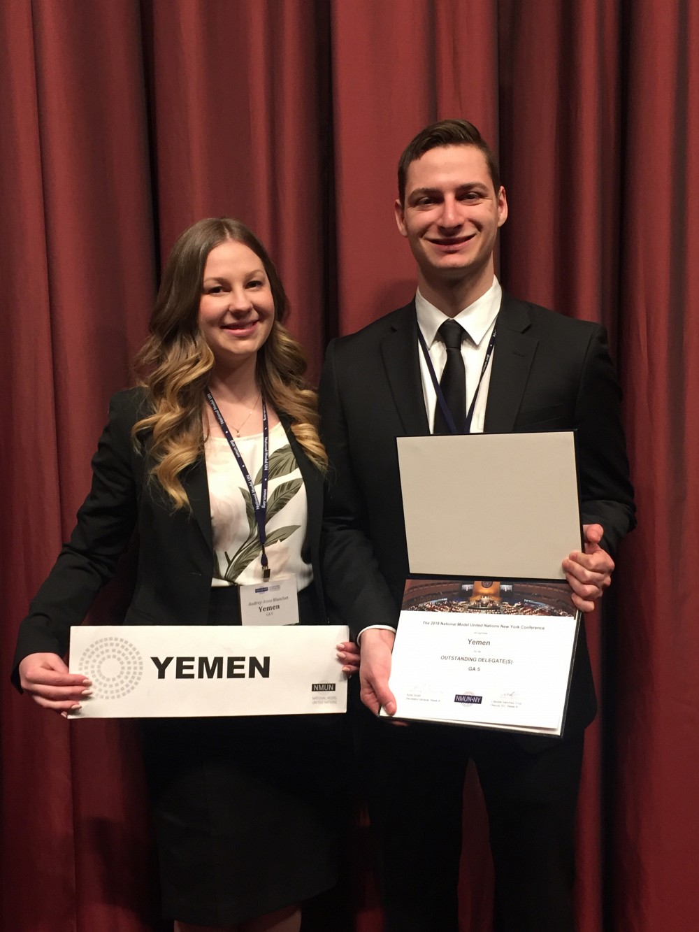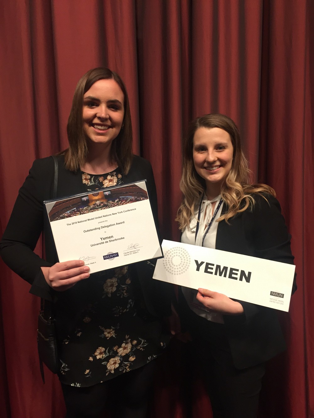 Parmi un comité de 400 personnes, Audrey Anne Blanchet et Karl Ouellet ont reçu le « Peer Award ». Le prix du meilleur « position paper » du comité « Economic and Social Commission for Western Asia » a également été décerné à un duo sherbrookois formé par Rosalie Tremblay et Catherine Villeneuve-Lavoie.