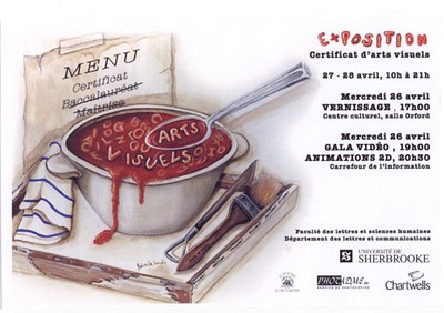 Sous le thème La soupe Crème des arts, l’affiche de l’exposition s’inscrit dans la lignée du pop art, dont Andy Warhol fut la tête d’affiche dans les années 60. Mais si celui-ci s’inspirait de l’acte de consommation, l’artiste Gabriela Sanchez qui a conçu l’affiche s’est inspirée du fait que les étudiants au certificat d’arts visuels démontrent la ferme volonté de créer, et de pousser plus loin la formation artistique en milieu universitaire.